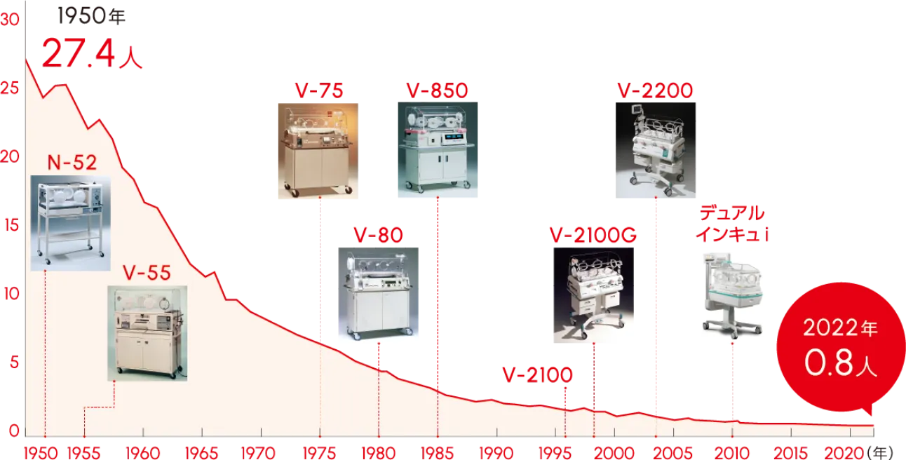 1950年、新生児死亡率は、1,000人あたり27.4人でしたが、医療の進歩により2022年には0.8人まで減少しました。新生児死亡率が世界トップレベルに低い日本で、アトムメディカルの保育器は選ばれています。